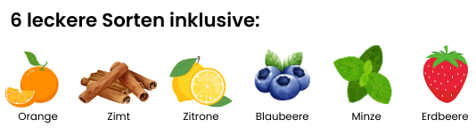 - 6 Aromabeutel – Erdbeere, Blaubeere, Minze, Orange, Zimt und Zitrone (jeweils mit 3 Duftsticks pro Beutel)